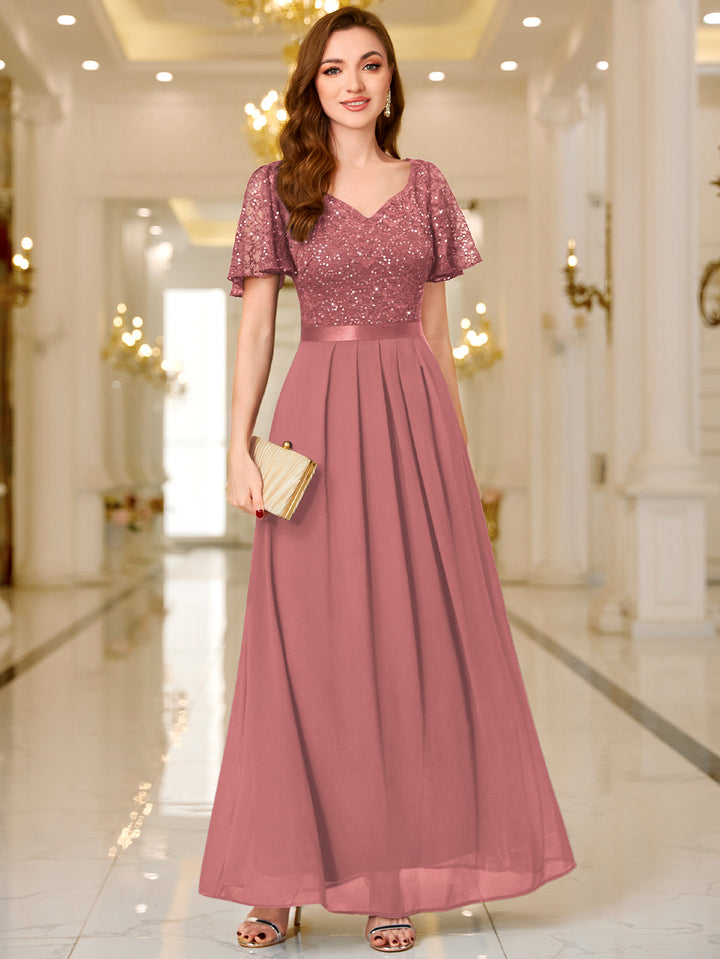 - Miusol Women's V-Neck Short Sleeves Evening Party Bridesmaid Long Maxi DressSweetheart Neckline: Frames the neckline beautifully for a classic and romantic look.